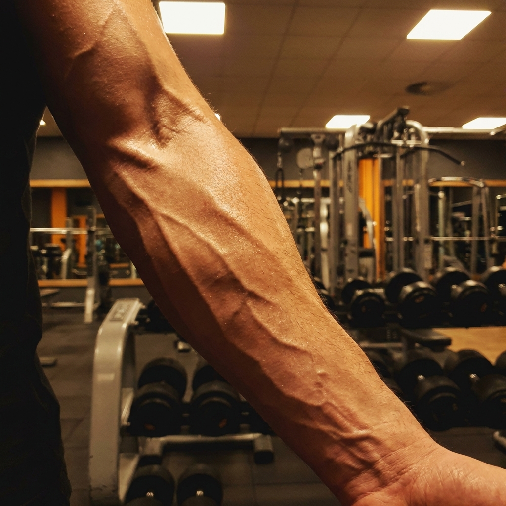 Detailed image of a flexed arm showing prominent veins and muscular definition.